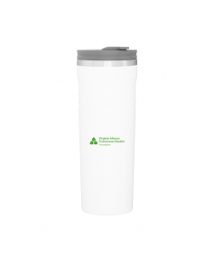 16.9 oz double wall tumbler with 18/8 stainless steel inner wall, stainless steel outer wall, vacuum insulation, push-on lid, swivel closure, stainless steel rim, and powder coated finish
