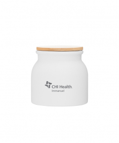 16.9 oz stoneware: matte white out / glossy white in with push-on bamboo lid; Hand wash recommended; Microwave safe with non-metallic imprint; 4 3/16 h x 4 3/16 (w/handle) w ; 500mL.