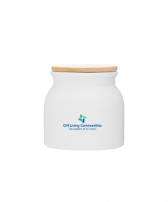 16.9 oz stoneware: matte white out / glossy white in with push-on bamboo lid; Hand wash recommended; Microwave safe with non-metallic imprint; 4 3/16 h x 4 3/16 (w/handle) w ; 500mL.