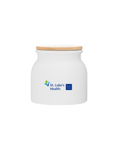 16.9 oz stoneware: matte white out / glossy white in with push-on bamboo lid; Hand wash recommended; Microwave safe with non-metallic imprint; 4 3/16 h x 4 3/16 (w/handle) w ; 500mL.