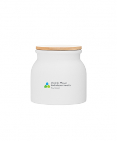 16.9 oz stoneware: matte white out / glossy white in with push-on bamboo lid; Hand wash recommended; Microwave safe with non-metallic imprint; 4 3/16 h x 4 3/16 (w/handle) w ; 500mL.
