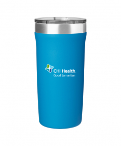 18 oz double wall 18/8 stainless steel thermal tumbler with vacuum insulation, brushed stainless steel rim, clear push-on acrylic lid with sliding closure, and powder coated finish. Hand wash recommended. Do not microwave. Complies with FDA, Prop 65. 7.25" H x 3.5" W