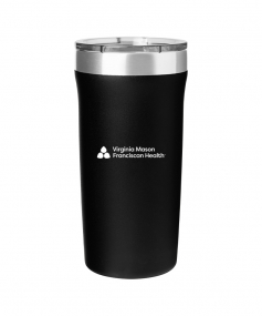 18 oz double wall 18/8 stainless steel thermal tumbler with vacuum insulation, brushed stainless steel rim, clear push-on acrylic lid with sliding closure, and powder coated finish. Hand wash recommended. Do not microwave. Complies with FDA, Prop 65. 7.25" H x 3.5" W