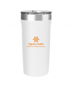 18 oz double wall 18/8 stainless steel thermal tumbler with vacuum insulation, brushed stainless steel rim, clear push-on acrylic lid with sliding closure, and powder coated finish. Hand wash recommended. Do not microwave. Complies with FDA, Prop 65. 7.25" H x 3.5" W