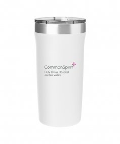 18 oz double wall 18/8 stainless steel thermal tumbler with vacuum insulation, brushed stainless steel rim, clear push-on acrylic lid with sliding closure, and powder coated finish. Hand wash recommended. Do not microwave. Complies with FDA, Prop 65. 7.25" H x 3.5" W