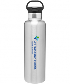 24 oz powder coated double wall 18/8 stainless steel thermal bottle with copper vacuum insulation, threaded gear-shaped insulated lid and carrying handle Complies with FDA, Prop 65. 11.25" H x 3" W