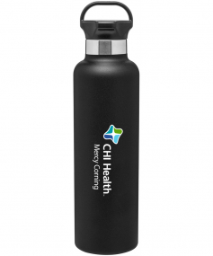 24 oz powder coated double wall 18/8 stainless steel thermal bottle with copper vacuum insulation, threaded gear-shaped insulated lid and carrying handle Complies with FDA, Prop 65. 11.25" H x 3" W