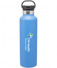 24 oz powder coated double wall 18/8 stainless steel thermal bottle with copper vacuum insulation, threaded gear-shaped insulated lid and carrying handle Complies with FDA, Prop 65. 11.25" H x 3" W