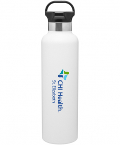 24 oz powder coated double wall 18/8 stainless steel thermal bottle with copper vacuum insulation, threaded gear-shaped insulated lid and carrying handle Complies with FDA, Prop 65. 11.25" H x 3" W
