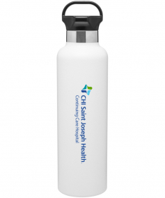 24 oz powder coated double wall 18/8 stainless steel thermal bottle with copper vacuum insulation, threaded gear-shaped insulated lid and carrying handle Complies with FDA, Prop 65. 11.25" H x 3" W