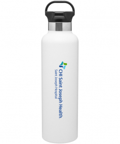 24 oz powder coated double wall 18/8 stainless steel thermal bottle with copper vacuum insulation, threaded gear-shaped insulated lid and carrying handle Complies with FDA, Prop 65. 11.25" H x 3" W