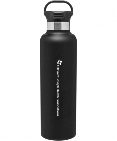 24 oz powder coated double wall 18/8 stainless steel thermal bottle with copper vacuum insulation, threaded gear-shaped insulated lid and carrying handle Complies with FDA, Prop 65. 11.25" H x 3" W