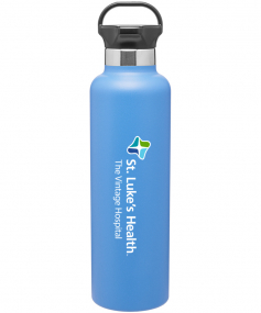 24 oz powder coated double wall 18/8 stainless steel thermal bottle with copper vacuum insulation, threaded gear-shaped insulated lid and carrying handle Complies with FDA, Prop 65. 11.25" H x 3" W