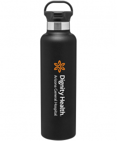 24 oz powder coated double wall 18/8 stainless steel thermal bottle with copper vacuum insulation, threaded gear-shaped insulated lid and carrying handle Complies with FDA, Prop 65. 11.25" H x 3" W