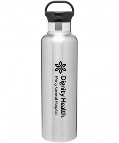 24 oz powder coated double wall 18/8 stainless steel thermal bottle with copper vacuum insulation, threaded gear-shaped insulated lid and carrying handle Complies with FDA, Prop 65. 11.25" H x 3" W