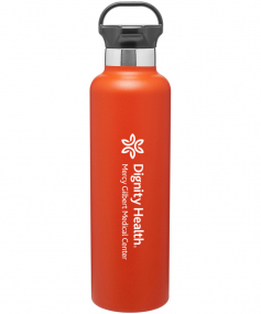 24 oz powder coated double wall 18/8 stainless steel thermal bottle with copper vacuum insulation, threaded gear-shaped insulated lid and carrying handle Complies with FDA, Prop 65. 11.25" H x 3" W