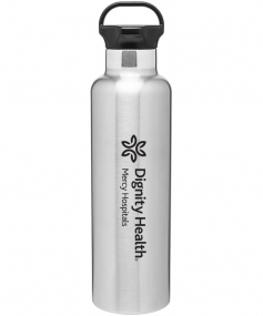 24 oz powder coated double wall 18/8 stainless steel thermal bottle with copper vacuum insulation, threaded gear-shaped insulated lid and carrying handle Complies with FDA, Prop 65. 11.25" H x 3" W