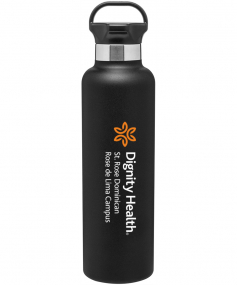 24 oz powder coated double wall 18/8 stainless steel thermal bottle with copper vacuum insulation, threaded gear-shaped insulated lid and carrying handle Complies with FDA, Prop 65. 11.25" H x 3" W
