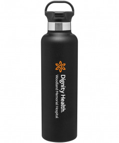24 oz powder coated double wall 18/8 stainless steel thermal bottle with copper vacuum insulation, threaded gear-shaped insulated lid and carrying handle Complies with FDA, Prop 65. 11.25" H x 3" W
