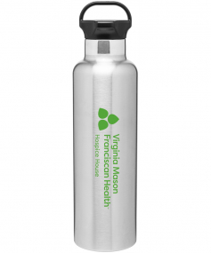 24 oz powder coated double wall 18/8 stainless steel thermal bottle with copper vacuum insulation, threaded gear-shaped insulated lid and carrying handle Complies with FDA, Prop 65. 11.25" H x 3" W