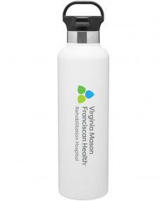 24 oz powder coated double wall 18/8 stainless steel thermal bottle with copper vacuum insulation, threaded gear-shaped insulated lid and carrying handle Complies with FDA, Prop 65. 11.25" H x 3" W