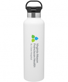 24 oz powder coated double wall 18/8 stainless steel thermal bottle with copper vacuum insulation, threaded gear-shaped insulated lid and carrying handle Complies with FDA, Prop 65. 11.25" H x 3" W