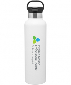 24 oz powder coated double wall 18/8 stainless steel thermal bottle with copper vacuum insulation, threaded gear-shaped insulated lid and carrying handle Complies with FDA, Prop 65. 11.25" H x 3" W