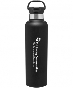 24 oz powder coated double wall 18/8 stainless steel thermal bottle with copper vacuum insulation, threaded gear-shaped insulated lid and carrying handle Complies with FDA, Prop 65. 11.25" H x 3" W