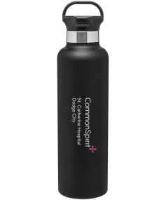 24 oz powder coated double wall 18/8 stainless steel thermal bottle with copper vacuum insulation, threaded gear-shaped insulated lid and carrying handle Complies with FDA, Prop 65. 11.25" H x 3" W