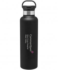 24 oz powder coated double wall 18/8 stainless steel thermal bottle with copper vacuum insulation, threaded gear-shaped insulated lid and carrying handle Complies with FDA, Prop 65. 11.25" H x 3" W