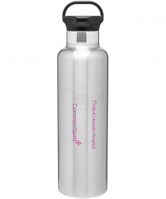 24 oz powder coated double wall 18/8 stainless steel thermal bottle with copper vacuum insulation, threaded gear-shaped insulated lid and carrying handle Complies with FDA, Prop 65. 11.25" H x 3" W