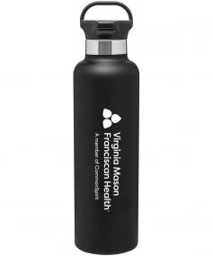 24 oz powder coated double wall 18/8 stainless steel thermal bottle with copper vacuum insulation, threaded gear-shaped insulated lid and carrying handle Complies with FDA, Prop 65. 11.25" H x 3" W
