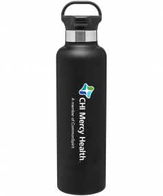 24 oz powder coated double wall 18/8 stainless steel thermal bottle with copper vacuum insulation, threaded gear-shaped insulated lid and carrying handle Complies with FDA, Prop 65. 11.25" H x 3" W
