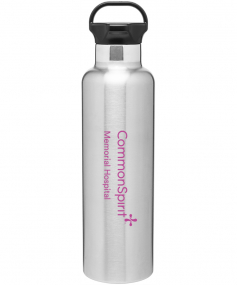 24 oz powder coated double wall 18/8 stainless steel thermal bottle with copper vacuum insulation, threaded gear-shaped insulated lid and carrying handle Complies with FDA, Prop 65. 11.25" H x 3" W