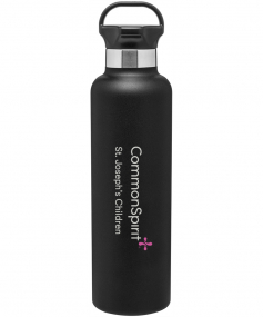 24 oz powder coated double wall 18/8 stainless steel thermal bottle with copper vacuum insulation, threaded gear-shaped insulated lid and carrying handle Complies with FDA, Prop 65. 11.25" H x 3" W