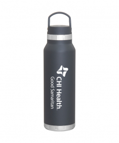 25 oz double wall 18/8 stainless steel thermal bottle with copper vacuum insulation, threaded insulated lid with carrying handle, high polish accent, stainless steel base, and powder coated finish. Hand wash recommended; Do not microwave. Dimensions: 10 H x 3".