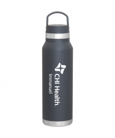 25 oz double wall 18/8 stainless steel thermal bottle with copper vacuum insulation, threaded insulated lid with carrying handle, high polish accent, stainless steel base, and powder coated finish. Hand wash recommended; Do not microwave. Dimensions: 10 H x 3".