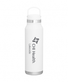 25 oz double wall 18/8 stainless steel thermal bottle with copper vacuum insulation, threaded insulated lid with carrying handle, high polish accent, stainless steel base, and powder coated finish. Hand wash recommended; Do not microwave. Dimensions: 10 H x 3".