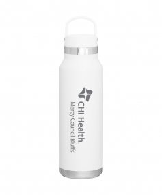 25 oz double wall 18/8 stainless steel thermal bottle with copper vacuum insulation, threaded insulated lid with carrying handle, high polish accent, stainless steel base, and powder coated finish. Hand wash recommended; Do not microwave. Dimensions: 10 H x 3".