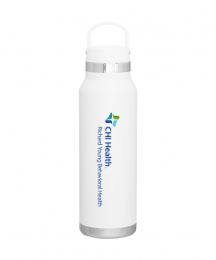25 oz double wall 18/8 stainless steel thermal bottle with copper vacuum insulation, threaded insulated lid with carrying handle, high polish accent, stainless steel base, and powder coated finish. Hand wash recommended; Do not microwave. Dimensions: 10 H x 3".
