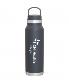 25 oz double wall 18/8 stainless steel thermal bottle with copper vacuum insulation, threaded insulated lid with carrying handle, high polish accent, stainless steel base, and powder coated finish. Hand wash recommended; Do not microwave. Dimensions: 10 H x 3".