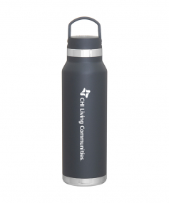 25 oz double wall 18/8 stainless steel thermal bottle with copper vacuum insulation, threaded insulated lid with carrying handle, high polish accent, stainless steel base, and powder coated finish. Hand wash recommended; Do not microwave. Dimensions: 10 H x 3".