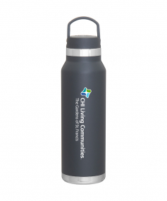 25 oz double wall 18/8 stainless steel thermal bottle with copper vacuum insulation, threaded insulated lid with carrying handle, high polish accent, stainless steel base, and powder coated finish. Hand wash recommended; Do not microwave. Dimensions: 10 H x 3".