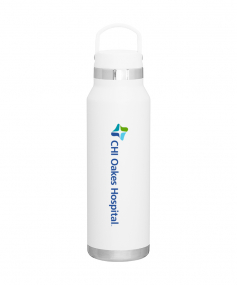25 oz double wall 18/8 stainless steel thermal bottle with copper vacuum insulation, threaded insulated lid with carrying handle, high polish accent, stainless steel base, and powder coated finish. Hand wash recommended; Do not microwave. Dimensions: 10 H x 3".