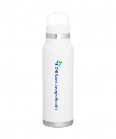 25 oz double wall 18/8 stainless steel thermal bottle with copper vacuum insulation, threaded insulated lid with carrying handle, high polish accent, stainless steel base, and powder coated finish. Hand wash recommended; Do not microwave. Dimensions: 10 H x 3".