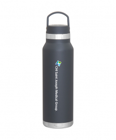 25 oz double wall 18/8 stainless steel thermal bottle with copper vacuum insulation, threaded insulated lid with carrying handle, high polish accent, stainless steel base, and powder coated finish. Hand wash recommended; Do not microwave. Dimensions: 10 H x 3".