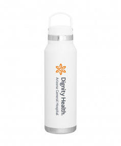 25 oz double wall 18/8 stainless steel thermal bottle with copper vacuum insulation, threaded insulated lid with carrying handle, high polish accent, stainless steel base, and powder coated finish. Hand wash recommended; Do not microwave. Dimensions: 10 H x 3".
