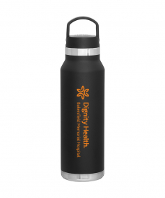 25 oz double wall 18/8 stainless steel thermal bottle with copper vacuum insulation, threaded insulated lid with carrying handle, high polish accent, stainless steel base, and powder coated finish. Hand wash recommended; Do not microwave. Dimensions: 10 H x 3".