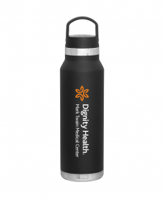 25 oz double wall 18/8 stainless steel thermal bottle with copper vacuum insulation, threaded insulated lid with carrying handle, high polish accent, stainless steel base, and powder coated finish. Hand wash recommended; Do not microwave. Dimensions: 10 H x 3".