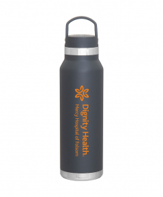 25 oz double wall 18/8 stainless steel thermal bottle with copper vacuum insulation, threaded insulated lid with carrying handle, high polish accent, stainless steel base, and powder coated finish. Hand wash recommended; Do not microwave. Dimensions: 10 H x 3".